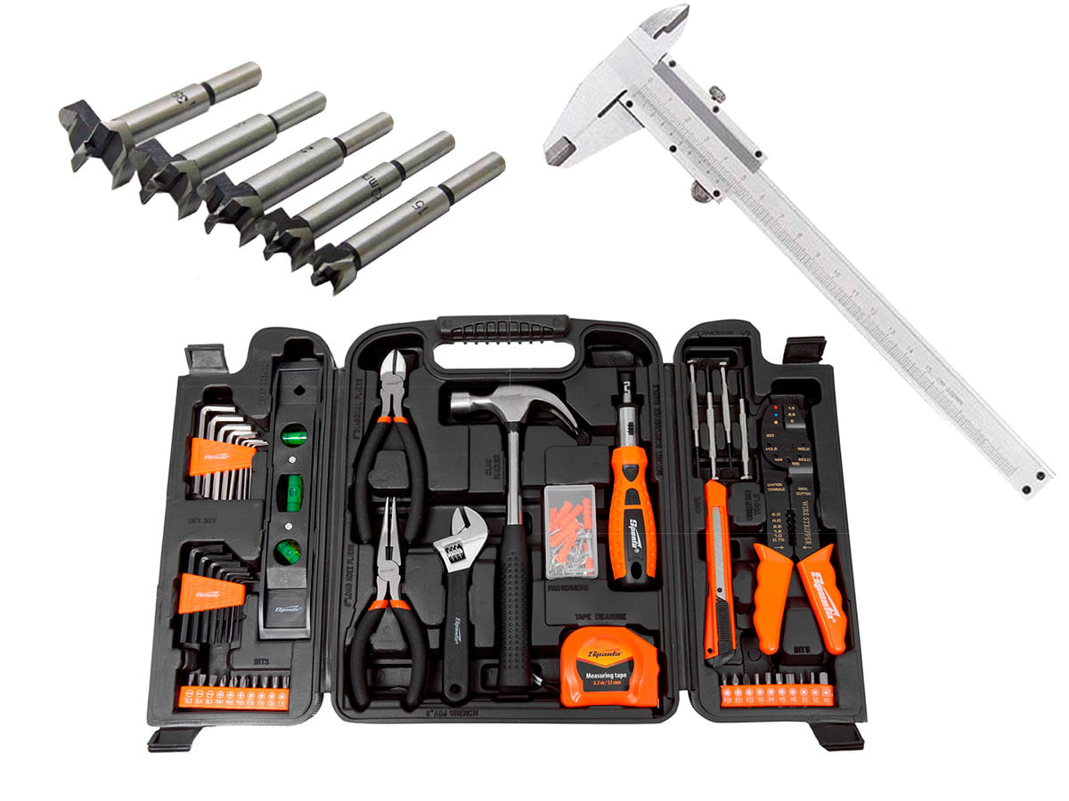 Kit Jogo Ferramentas Montagem em Bancada 129Pç e Broca Forstner 5Pç e Paquímetro