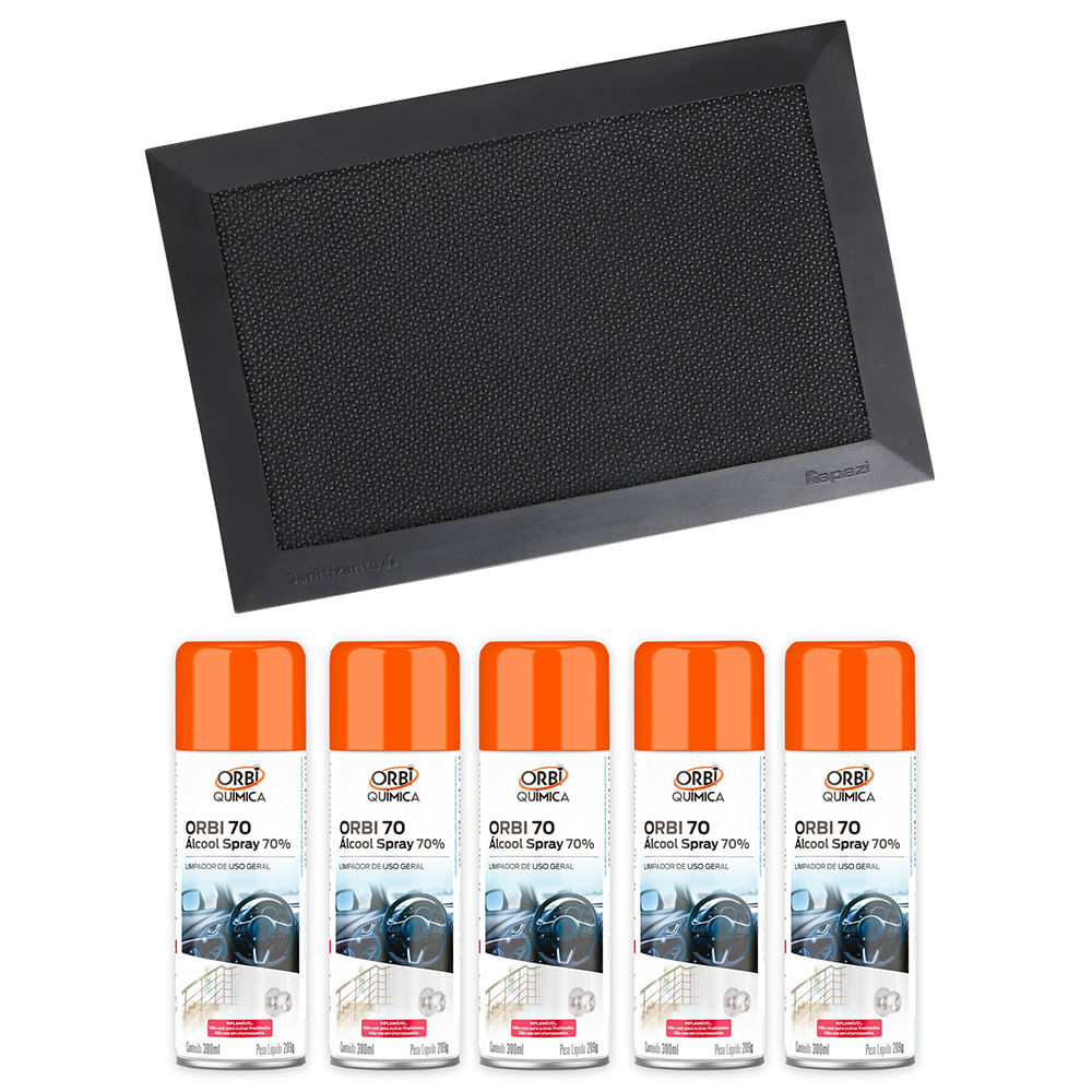 Kit Tapete Sanitizante 38x58cm Kapazi Preto e 5 Álcool Spray 70°300ml Orbi